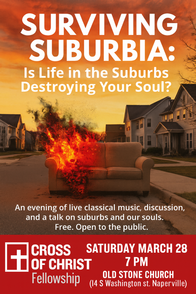 I’m looking forward to an event our church is hosting on 3/28/26 in downtown Naperville called “Surviving Suburbia.” Here’s a flyer for it for those interested: